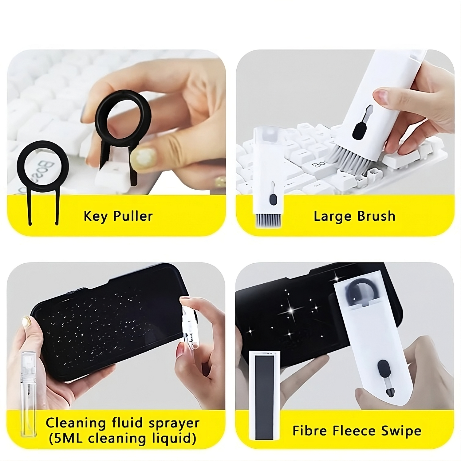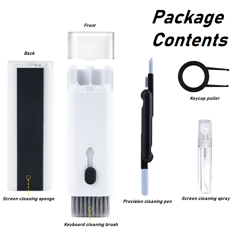 CONTENTS: Computer Keyboard Cleaner Brush, Screen cleaner, Headphone Cleaning Pen, Cleaning Tools, Keycap Puller