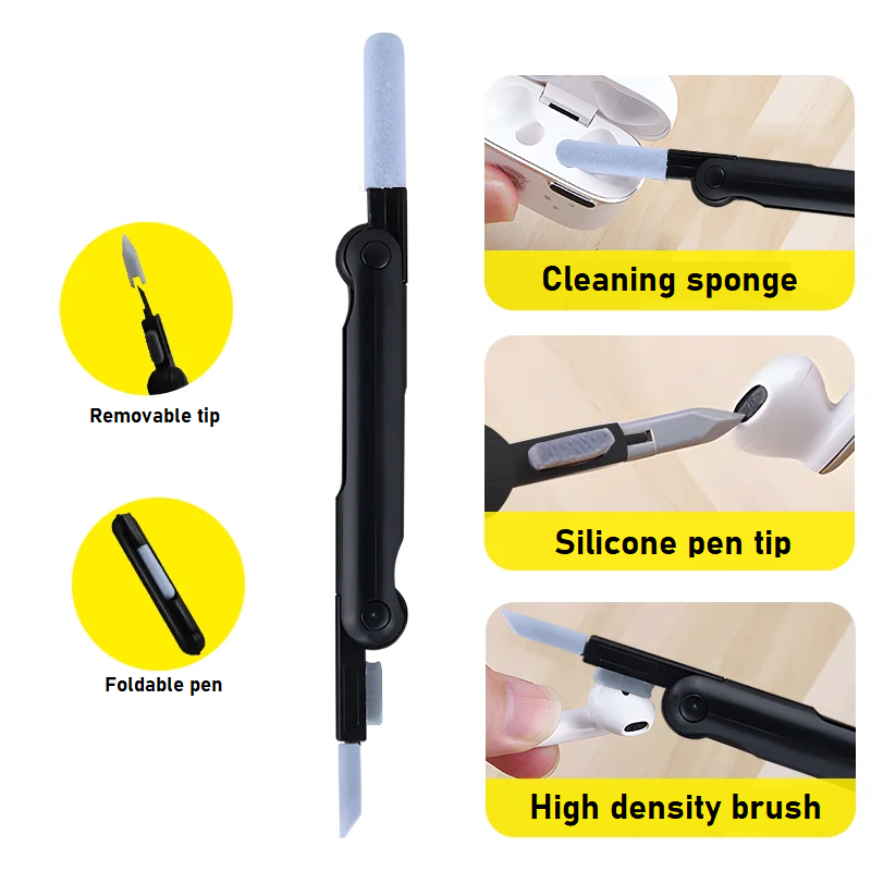 The cleaning pen has a soft sponge on one side for getting into small spaces, a silicone pen tip on the other for getting gunk out of charging ports, and a brush for cleaning debris off of your things.